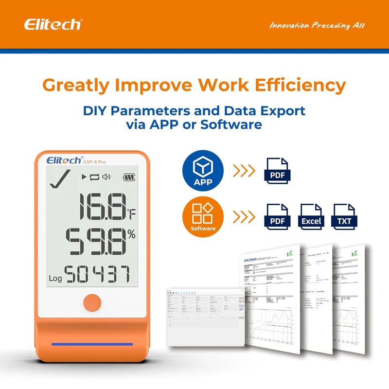 Elitech GSP-6Pro is a Bluetooth-enabled temperature and humidity data logger designed for precise monitoring in pharmaceutical, vaccine, and cold storage environments. With a storage capacity of 100,000 points, real-time data access via a mobile app, and a calibration certificate for ensured accuracy, it offers a reliable and user-friendly solution for maintaining regulatory compliance and protecting sensitive goods.